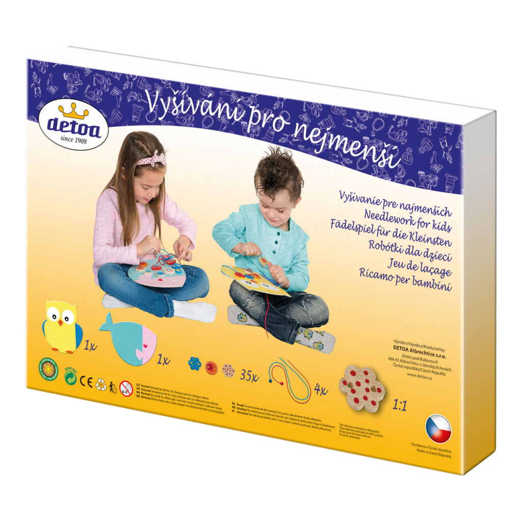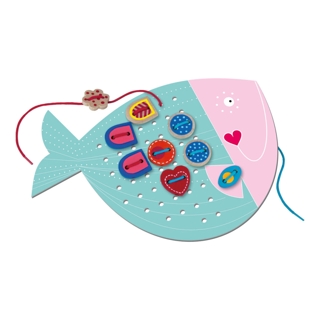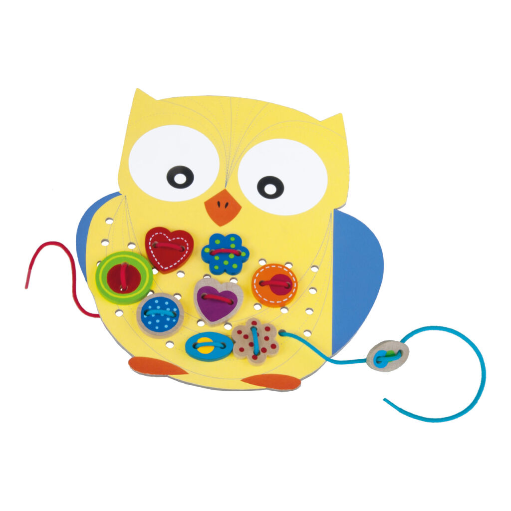 The package contains two beautiful cardboard templates (very sturdy material) of an owl and a fish, to which children sew wooden components using strings, 35 printed wooden components, and 4 laces.