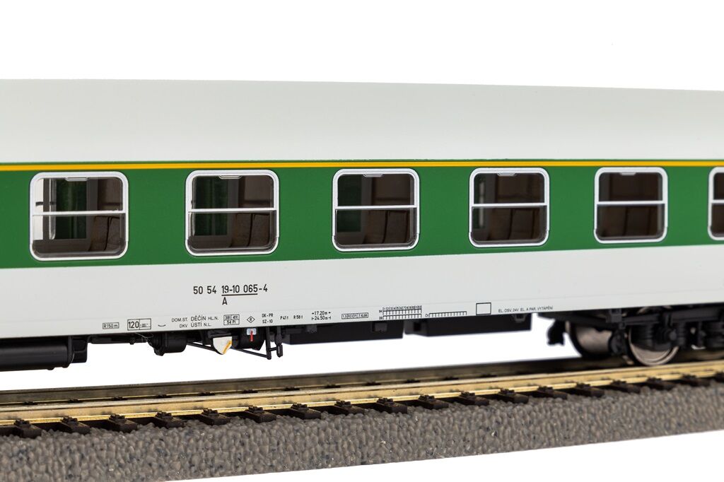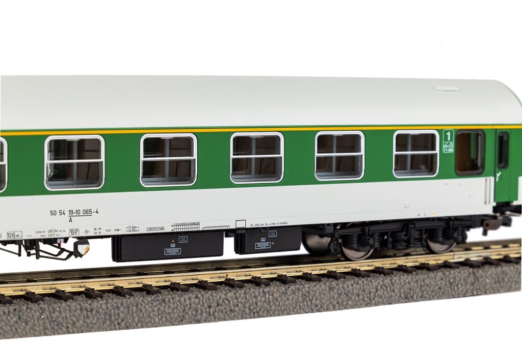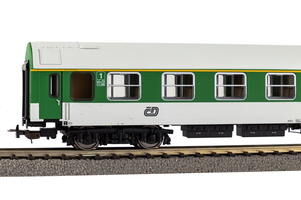 The Czech Railways 1st class passenger car belongs to the Y model series. The new Y series car models are characterized by their accurate prototype design. The model is based on actual cars operated by Czech Railways, which provides authenticity when assembling a specific railway operation. This 1st class passenger car is an excellent addition to model railways, with a realistic appearance and attention to detail, such as sharp and very distinctive engravings in the door area, sophisticated bogies, and a car floor with units. It can be enhanced by the additional installation of interior lighting, which will be particularly effective during nighttime operation.