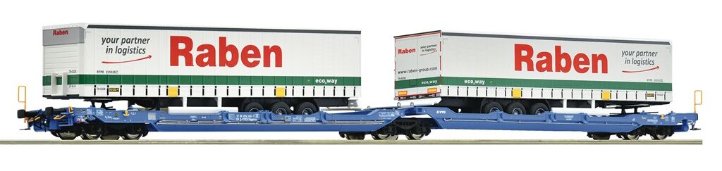 This is a detailed model of a VTG Sdggmrs 738/T3000e container wagon loaded with two semi-trailers from the Raben transport company. The wagons are made of die-cast metal and can be fitted with a vertical or tilting shunting lever. The model's swivel joint design corresponds to the original.